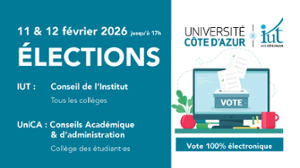 - À l'attention des étudiants de l'IUT Nice Côte d'Azur : ÉLECTIONS DU CONSEIL DE L'INSTITUTDes élections les 11 et 12 février 2026 à l’IUT Nice Côte d’Azur,il est temps de faire campagne !